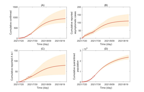 2.3防控加强,即从7月29日开始加强相关防控措施。不妨假设人均日接触数c开始指数递减。据模型预测:截至到8月20日,累计新增确诊633人(95%CI:[523,805]),累计新增无症状感染者80人(95%CI:[58,104]),如图4所示。当考虑更多防控措施的进一步加强,比如个体防护、检测率等的提升,疫情规模有可能进一步下降。