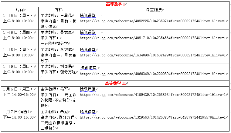 1月5日起,学院面向全校学生开设线上串讲,包括“高等数学I、II”“线性代数与解析几何”“概率论与数理统计”“复变函数和积分变换”“数学物理方程”等多门课程,总结各课程教学内容,系统梳理课程学习应该掌握的知识点和计算方法。