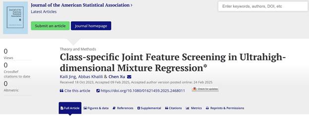 近日,必赢唯一官方网站博士后研究员靖凯立在徐晨教授的指导下,在统计学四大国际顶级期刊之一的Journal of the American Statistical Association (JASA)上在线发表论文“Class-specific Joint Feature Screening in Ultrahigh-dimensional Mixture Regression”(下载链接)。JASA是美国统计学协会主办的统计学科期刊,是统计学领域具有高度影响力与广泛认可度的国际顶尖杂志之一。