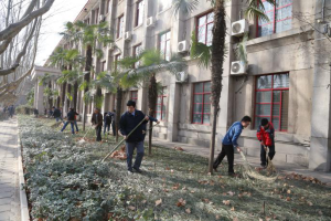 在各个支部书记和工会小组长的带领下,全院50多名党员和非党员教职工一起对理科楼南侧和东西两侧的花园草坪,以及北侧的卫生死角进行了彻底清扫。大家纷纷争拿扫帚、簸箕、犁爬、铁锨等工具,走进草丛和沟槽角落,无惧脏累,有的铲除藤条,有的耙树叶、垃圾,有的洒水、拔草,还有的铲垃圾、拣拾草坪中的各种建筑垃圾和杂物。特别的是清扫了多处多年没有清理的死角,大家边清扫边笑谈,好不热闹,直到把一堆堆垃圾装上校园环保车大家才满意地离开。