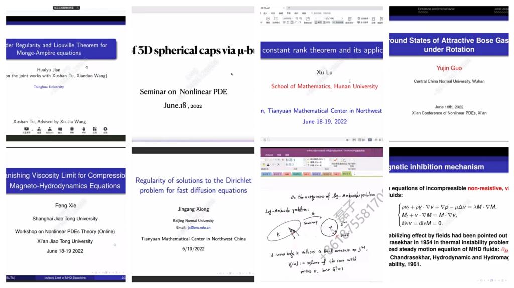 由国家天元数学西北中心主办的2022年“非线性偏微分方程理论西安研讨会”于6月18日-19日成功举办。会议由西安交通大学、陕西师范大学、西北工业大学和西北大学偏微分方程方向的教师代表共同组织召集。北京应用物理与计算数学研究所江松院士、香港中文大学辛周平教授等30位特邀嘉宾出席会议。来自北京大学、清华大学、上海交通大学、中国科学技术大学、北京师范大学、四川大学、兰州大学等高校的180余位学者在线上参加了会议。