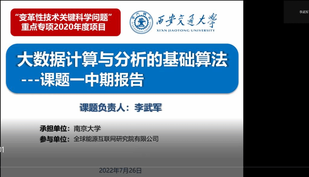 2022726日,西安交通大学主持召开国家重点研发计划“变革性技术关键科学问题”重点专项“大数据计算与分析的基础算法”项目中期进度汇报会。会议采用线上方式进行,项目负责人西安交通大学孟德宇教授,课题一负责人南京大学李武军教授,课题二负责人西安电子科技大学焦永昌教授,课题三负责人西安交通大学薛江教授,以及西安电子科技大学张立教授、全球能源互联网研究有限公司张波研究员、香港科技大学霍英东研究院杨灿教授、南方医科大学张华教授、西安交通大学林绍波教授、西安交通大学李飞高级工程师、西安交通大学许鑫工程师等相关研究骨干参加会议。项目负责人孟德宇主持会议。
