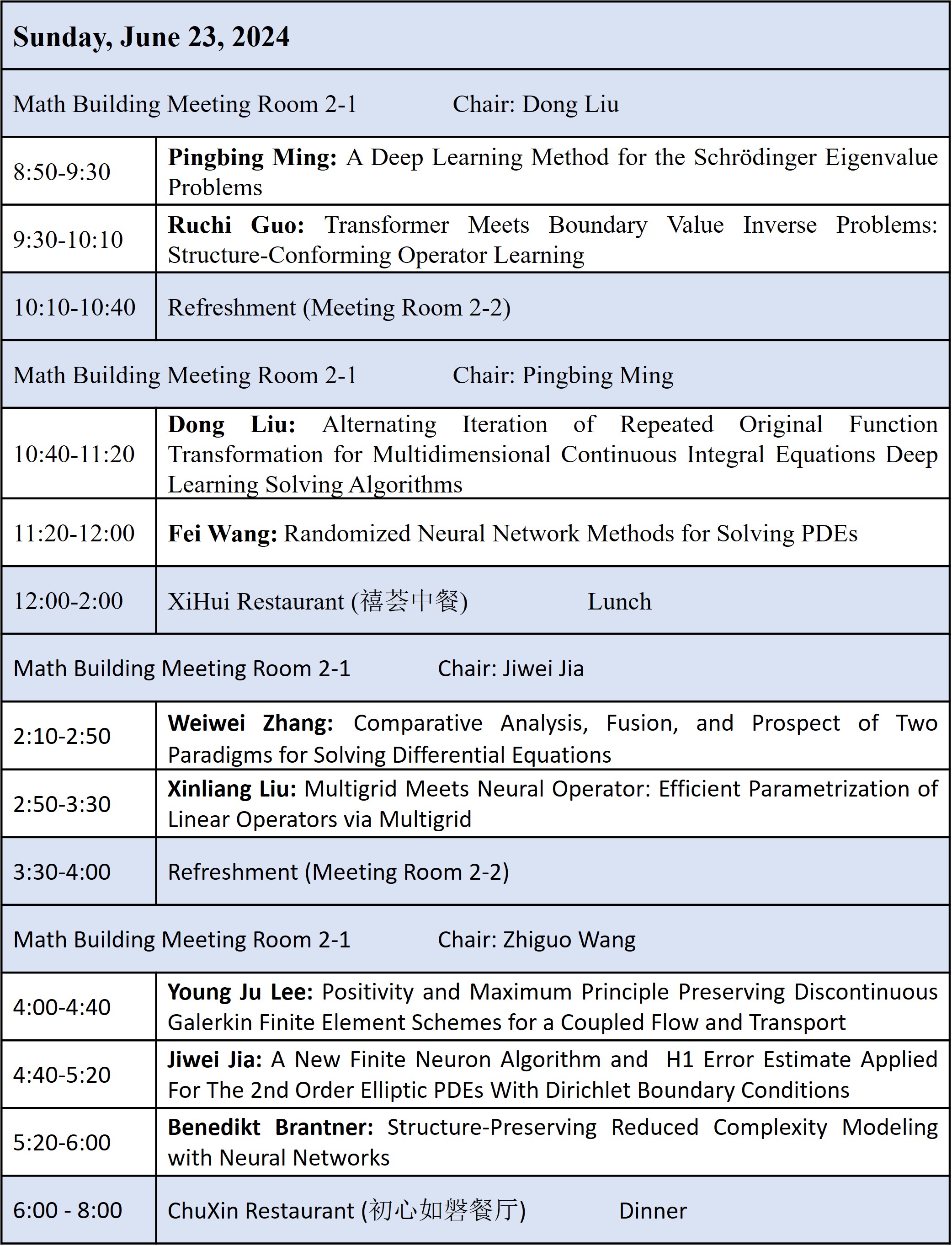 The main objective of this workshop is to provide a platform for renowned scholars from around the world to come together and share their experiences and insights in the realm of deep learning and numerical methods for PDEs. Through the exchange of innovative ideas and collaborative research, we aim to pave the way for future research directions and advancements in this field. During the workshop, we will showcase the latest advancements in the application of deep learning and numerical methods to PDEs, with a specific emphasis on their applications in science and engineering. By fostering interdisciplinary collaboration, we seek to explore faster, more effective, and highly accurate solution algorithms that can address the complex practical issues associated with PDEs. We extend a warm invitation to researchers, experts, and practitioners who are actively involved or interested in this field to join us at the workshop. Let us come together and collectively push the boundaries of knowledge, foster collaboration, and shape the future of solving PDEs using deep learning and numerical methods.