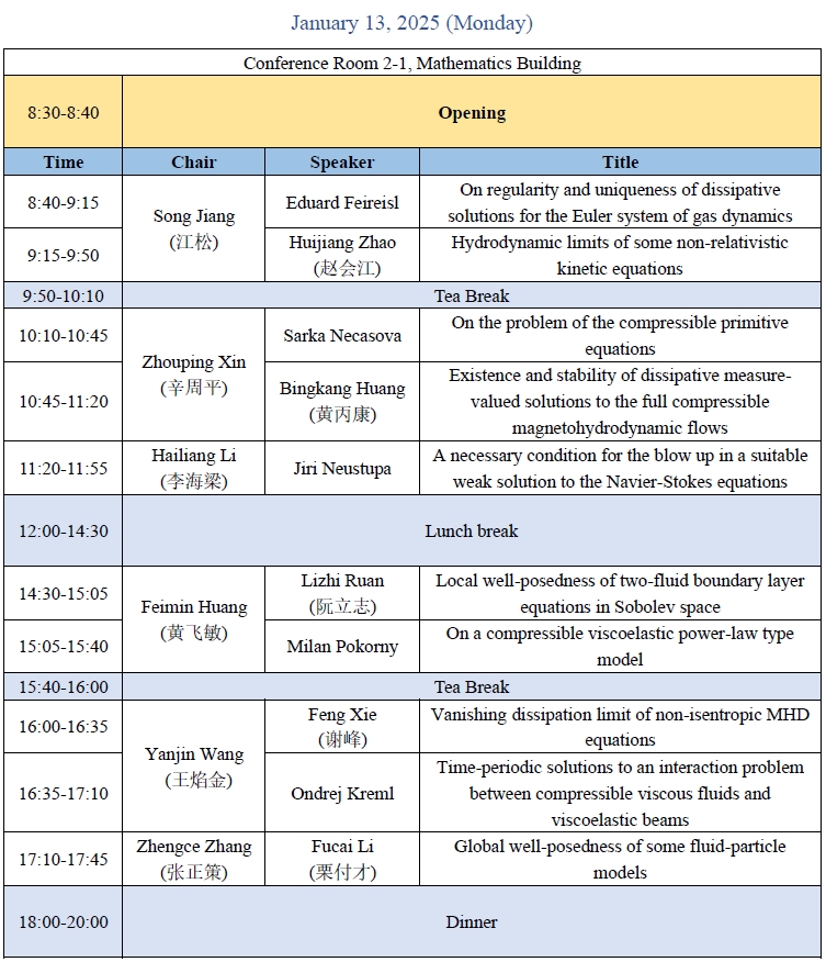 The mathematical study of partial differential equations in fluid mechanics is an important area of research in the field of partial differential equations, with significant theoretical and practical implications. In recent years, this field has advanced rapidly, with numerous breakthroughs in general theory and special solution theory. Czech mathematicians developed their own system for studying fluid mechanics equations and achieved significant research results. At the same time, many Chinese mathematicians have had close exchanges and long-term collaborations with Czech mathematicians working on mathematical fluid dynamics. The conference will serve as a forum for reporting new research breakthroughs, exchanging research ideas, and planning new collaborative research during and after the conference.