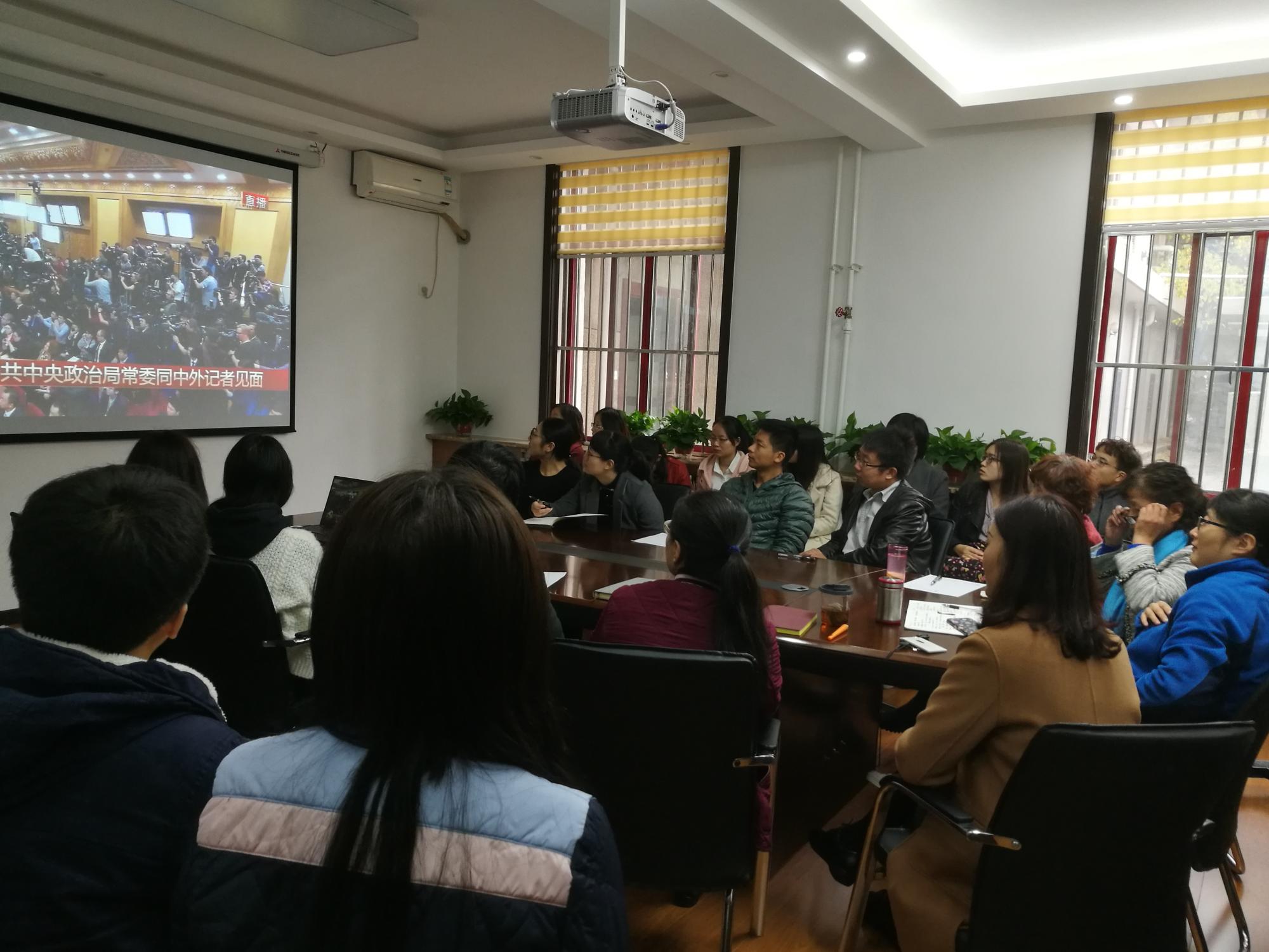 10月25日上午11:45,新一届中共中央政治局常委在人民大会堂一楼东大厅同中外记者见面。必赢集团网站组织学院师生党员代表在112会议室观看见面会,分党委副书记易媛、学院青年骨干教师代表、机关党支部成员和学生党员代表等一起观看了实况直播。