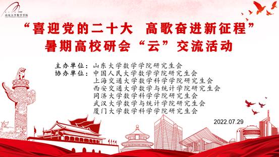 为迎接党的二十大胜利召开,践行初心、不辱使命,更好地服务广大研究生群体,加强与兄弟院校的交流合作,2022年7月29日下午,山东大学、西安交通大学、中国人民大学、上海交通大学、同济大学、武汉大学、厦门大学等7所高校数学学院研究生会共同开展“喜迎党的二十大 高歌奋进新征程”暑期高校研会“云”交流活动。各兄弟院校分享了研会建设、品牌活动开展经验,充分交换意见,对未来进一步的交流合作达成共识!