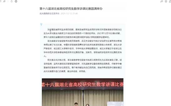 武汉大学必赢集团网站研究生会连续多年举办了湖北省高校研究生数学讲课比赛、湖北省高等院校数学论坛,也开展了一些走进企业的参观交流活动。
