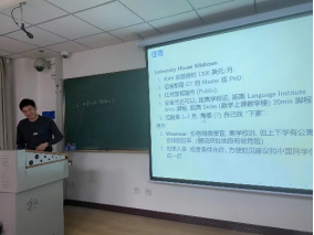 活动的第一个环节是梁浩然同学的分享报告——“我在欧陆读数学“,梁浩然同学从留学目的地的选择、申请步骤及费用、交流中的学习和生活经历等多个角度分享了自己的心得和见闻。