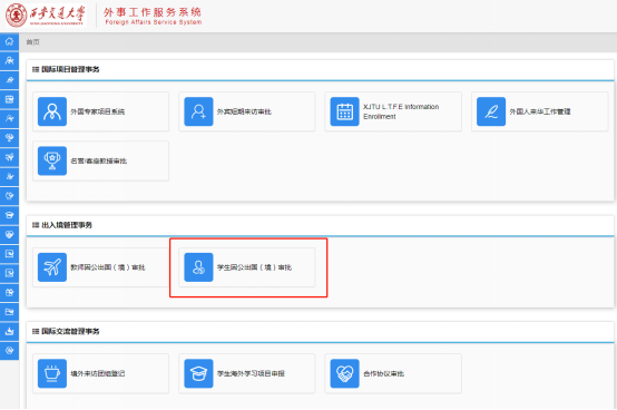 西安交通大学外事工作服务系统:http://ims.xjtu.edu.cn/Main/LeftMenuT.do